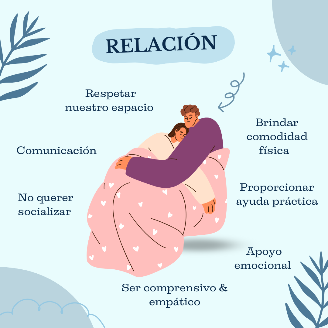 La comunicación es la clave en todas las fases, es como único nuestra pareja nos podrá entender mejor lo que nos está sucediendo. A nosotros nos ha tocado aprender a ser más comprensivos & empáticos, para esto hay que escuchar sin interrumpir, reconocer los sentimientos & validar esos sentimientos. Durante esta fase hay momentos donde prefiero estar sola & mi esposo respeta mi espacio, pero asegurándose de que este bien.
